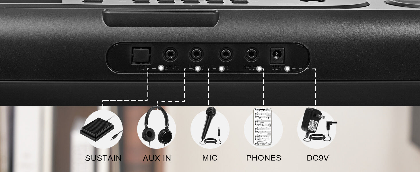 - Multi-Functional Beginner Digital Keyboard: This 61-key full-size electronic piano features recording, playback, chords, drum kits, a metronome, and transposition to meet your various playing needs. The piano keyboard can be easily connected to a microphone, headphones, sustain pedal, and more. Plug in your headphones to practice quietly and enjoy your music to the fullest