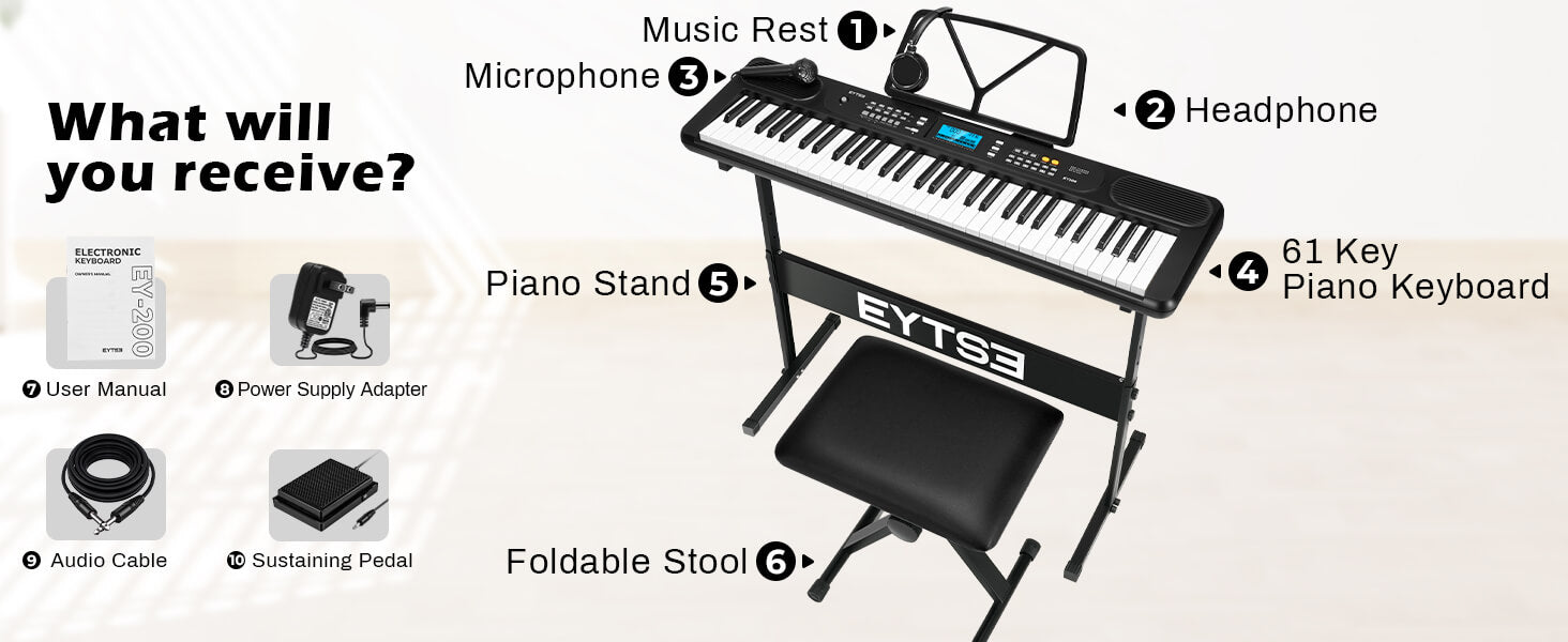 Eytse EY200 61 Key Keyboard Piano, Beginners Full Size Keys Electronic Keyboard, Complete Electric Keyboard Set