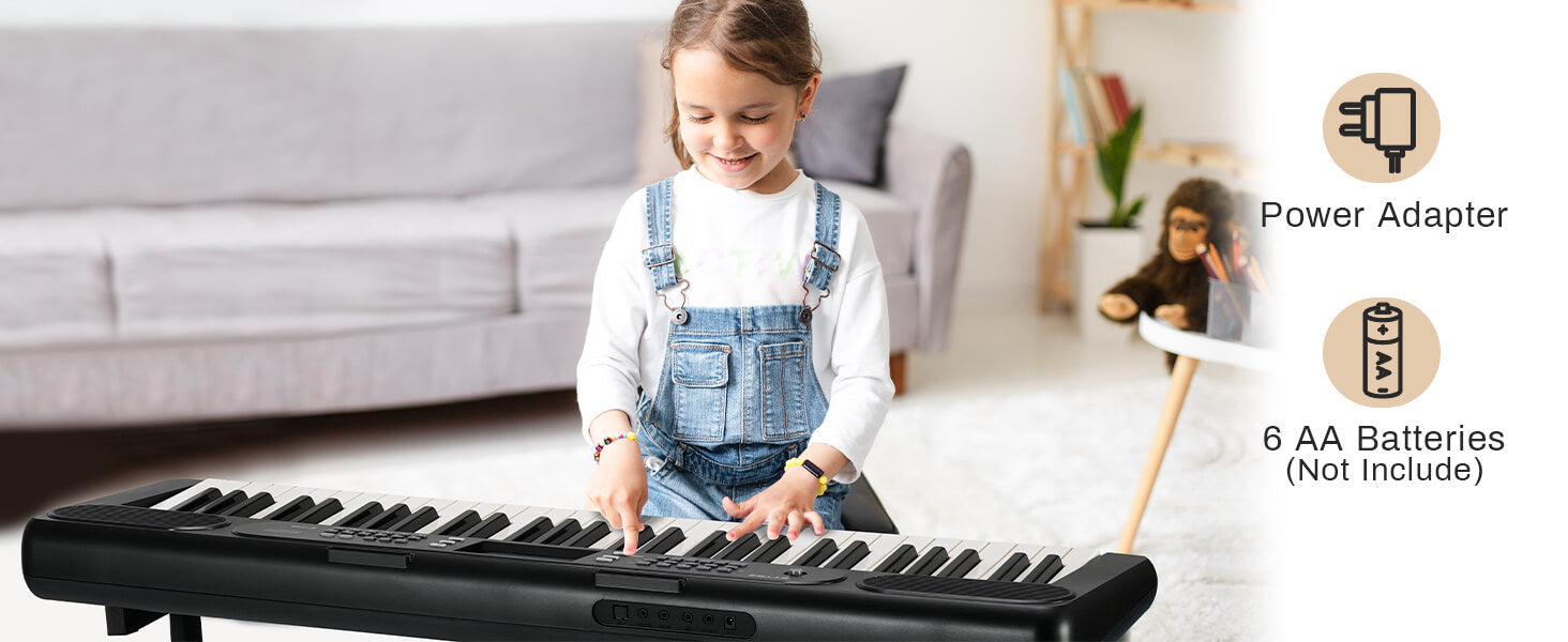 The EY-300 electronic piano keyboard can be powered not only by the power adapter included in the package, but also by AA batteries, so you can enjoy playing even when there is no power supply.
