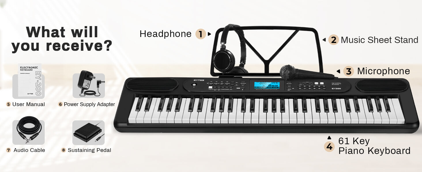 - Complete Kit : The Portable Electronic Keyboard Kit includes a 61-key full-size electric piano, a music stand, a sustain pedal, a microphone, headphones, and a power adapter. This complete kit eliminates the hassle of purchasing each accessory separately and is both lightweight and portable. Powered by the included power adapter or 6 AA batteries, it is easy to take outdoors for a great musical journey