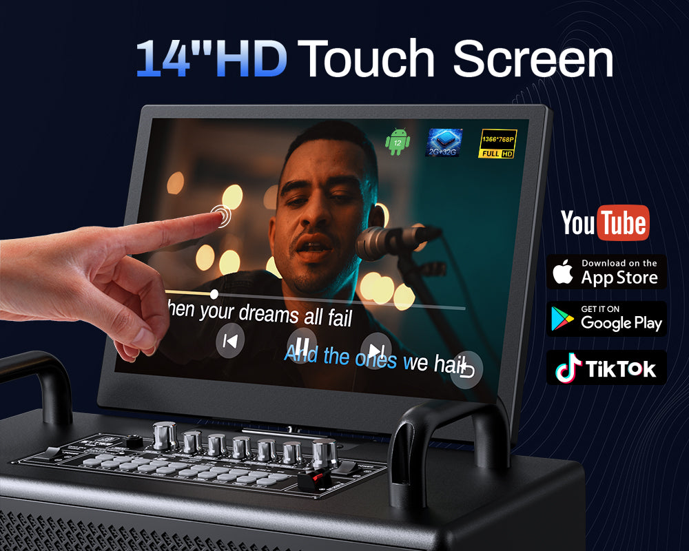 Our karaoke machine features a 14-inch 1366*768 high-resolution IPS touchscreen tablet, equipped with 2GB RAM and 32GB ROM, providing ample space for applications and music/videos. It rotates 270° and folds 180° for multi-angle viewing, with the screen displaying lyrics in real-time.