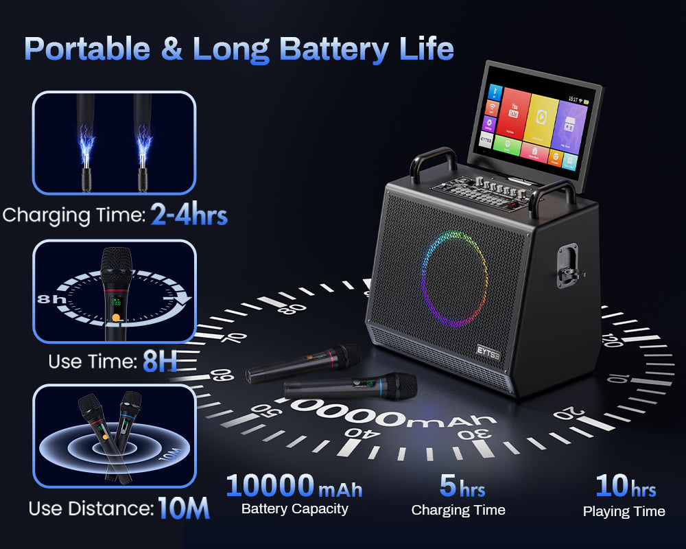 【Rechargeable and Long-lasting Battery】With its powerful 10000mAh rechargeable battery, charging for 5 hours, enjoy up to 15 hours of continuous playtime. Whether you're at an indoor dance or an outdoor gathering, this extensive battery life ensures you can rock out to your favorite tunes without being tethered by cords. It's perfect for outdoor parties, rooftop gatherings, karaoke nights, or singing performance sessions wherever you are.