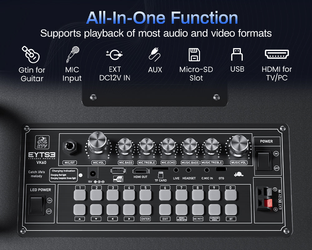 【Multiple Connections】This karaoke machine can support wireless connection, HDMI, 1/4" microphone input/ musical instrument input, 1/8" headphone input, 1/8" microphone input, OTG, musical instrument input, AUX-IN, USB input, live streaming, and TF connection. It's compatible with computers, PCs, laptops, electronic musical instruments, iOS and Android systems. Whether you're into karaoke, gaming, or live streaming, this speaker system is your all-in-one solution to kickstart your new journey.